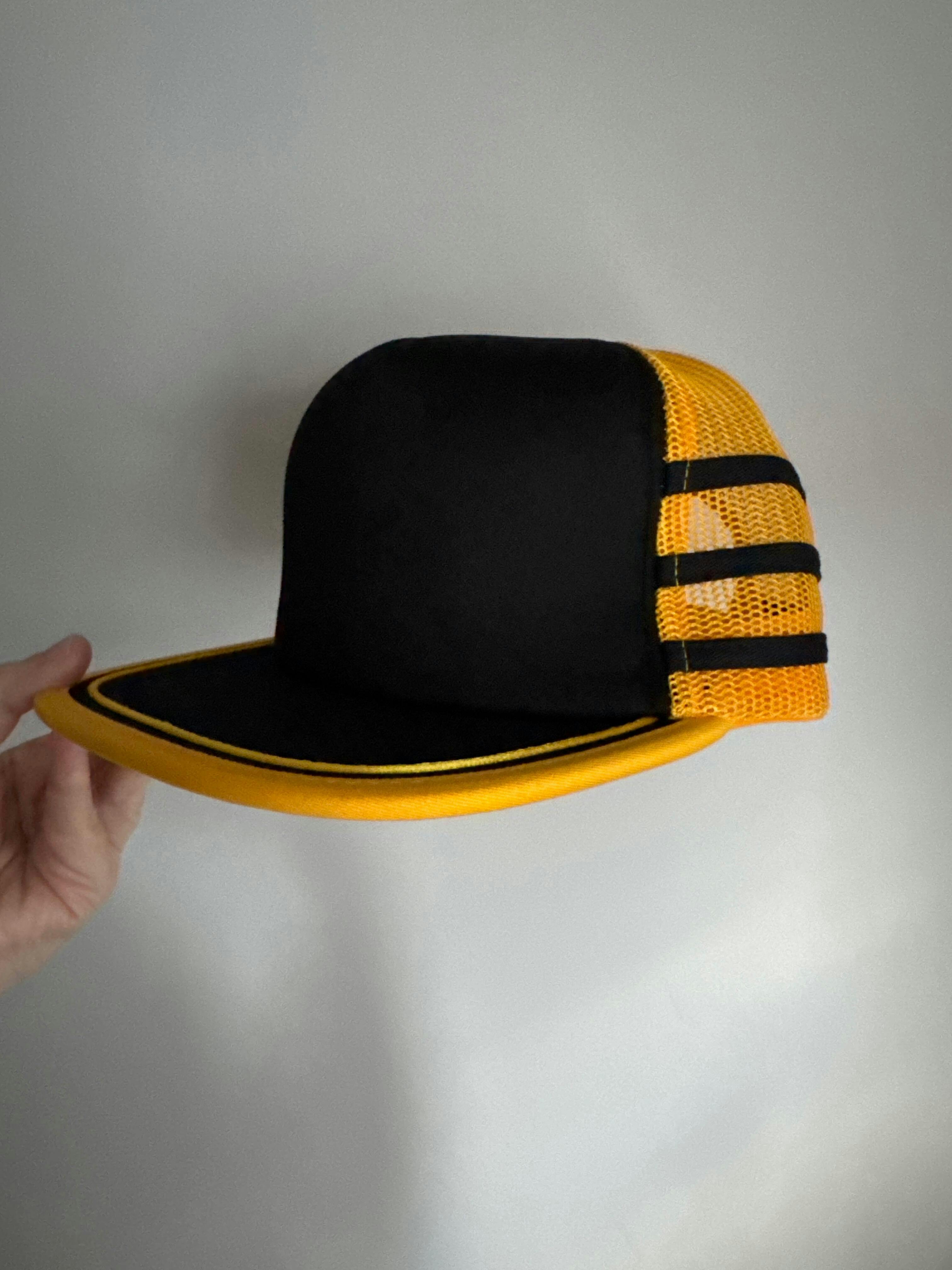 These are not replicas - they are the real deal, exactly as supplied for the final season of the series. With its rope-trim, bold yellow design, black side stripes, and adjustable snapback fit, this cap is both a collector’s dream and a wearable slice of Hawkins history.